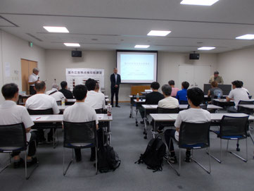 屋外広告物点検能講習会が、大津市のコラボしが21において、8月2日(土)9時より、午前を更新者講習、午後を新規対象者の講習会として開かれ、各24名、24名の計48名が参加し、講習会の終了後に修了証が渡された。